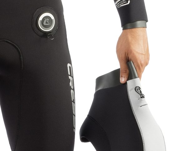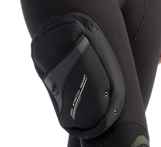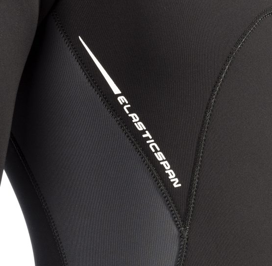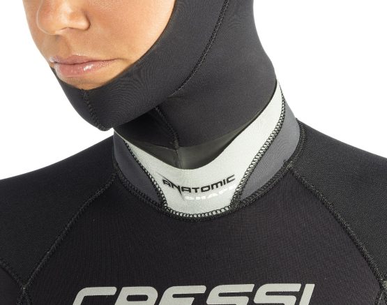 - Cuello en neopreno de 3 mm, con forro interior Ultraspan© y exterior Glide Skin©, para facilitar la colocación del traje y la estanqueidad de esta crítica zona, especialmente en el caso de las buceadoras, con un perímetro de cuello reducido. El patronaje Anatomic Shape prevé el perfil idóneo del cuello respecto del pecho (120º) y evita la opresión en esta zona. Una segunda solapa exterior mejora la estética y la estanqueidad del cuello.