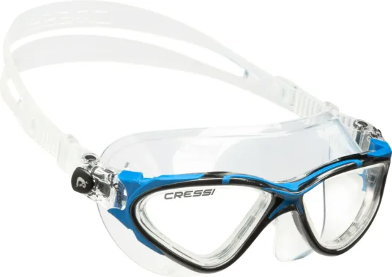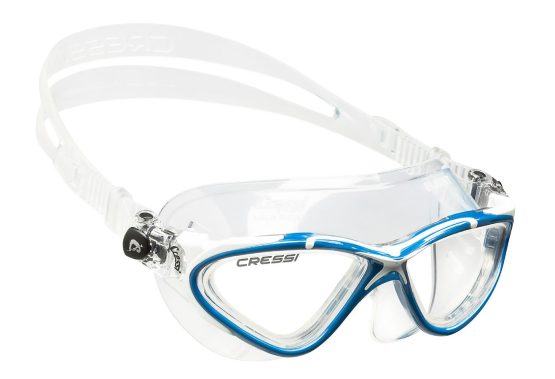- Cristales en policarbonato con tratamiento anti-empañante y anti-UV, levemente curvados en los laterales para evitar aberraciones ópticas comunes en los cristales curvados bajo el agua.